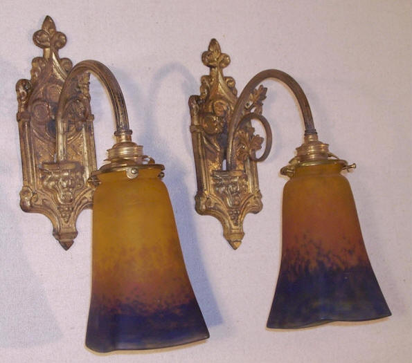 Paar Wandappliquen Messing 2 Tulipen Pulverglas farbig ~ 1915 H 32 cm Tiefe 18 cm |