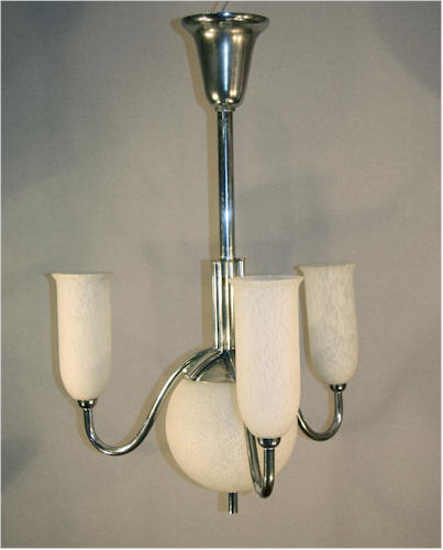 Messing, verchromt 1 Kugel, 3 Röhren Pulverglas weiss ~ 1940 L 90 cm Ø 60 cm |