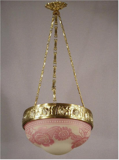 Deckenampel an 3 Ketten hängend Überfangglas geätzt + geschnitten ~ 1915 L 80 cm Ø 35 cm |