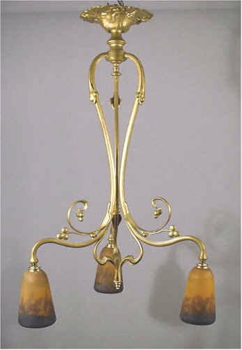Messing 3 Tulipen Pulverglas farbig ~ 1915 L 80 cm Ø 50 cm |