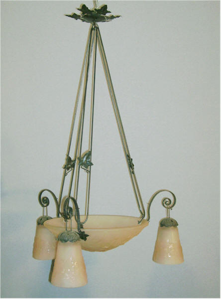 Schmiedeeisen Schale 3 Tulipen Pressglas lachsfarbig ~ 1925 L: ca. 80 cm Ø: ca. 55 cm Ø: Schale 40 cm |